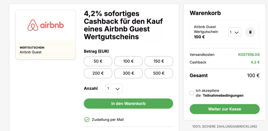 Aktuell bekommst du über iGraal beim Kauf eines Airbnb-Wertgutscheins 4,2 % Cashback. In der Vergangenheit lag der Satz auch schon höher, z. B. bei 4,8 % im Februar 2025. Es lohnt sich also regelmäßig zu prüfen, wie viel Prozent Cashback (= Geld zurück) du für eine Airbnb Buchung bekommst.