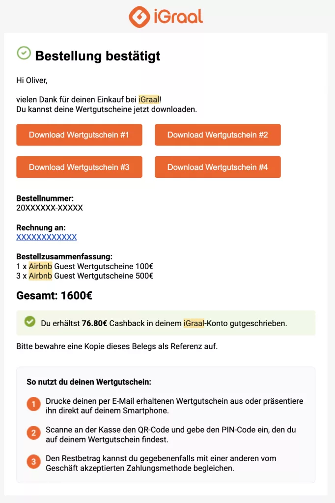 - Airbnb-Account: Nutze beim Kauf und bei der Buchung den selben Airbnb-Account, sonst wird das Guthaben nicht erkannt.